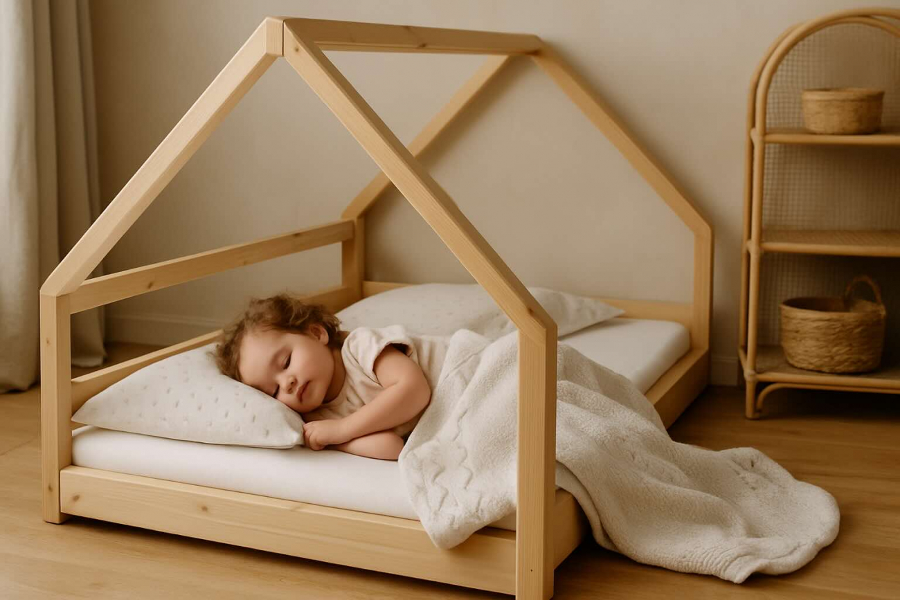 | Hausbett | Bettgestell mit Dachrahmen, häufig im Skandi-Stil | Ab 2 Jahren | Dekorativ, fördert Rückzug und Fantasie |